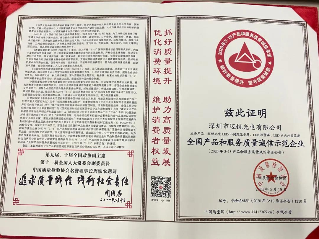 近日,通过中国企业信用公共服务平台和深圳市中品信用技术有限公司的评估,星空电竞光电二次获得AAA级信用企业证书-信用程度高,合同履约能力强,具有优秀的信用纪录,经营状况佳,盈利能力强,发展前景广阔。